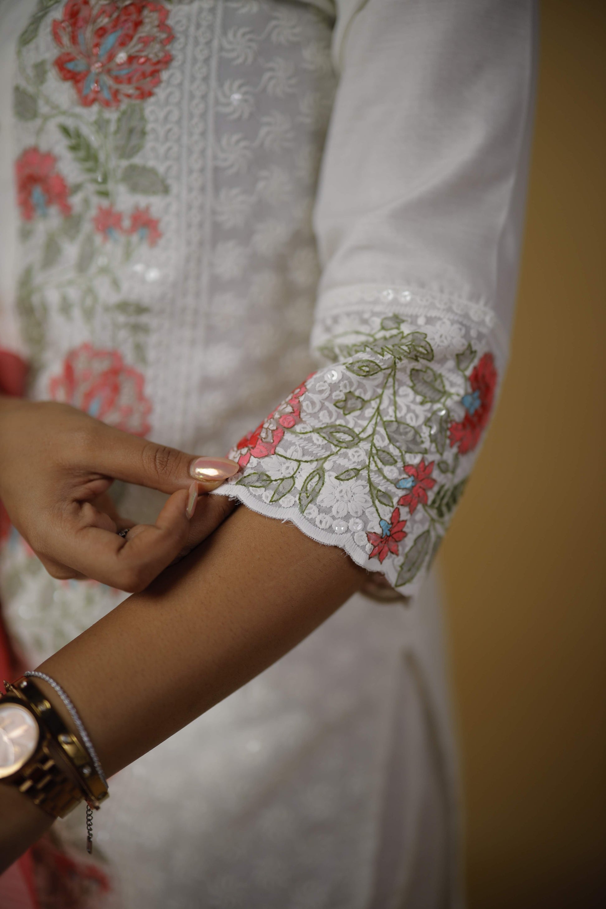 Kurta: White straight Kurta with intricate floral embroidery in pastle pink and green tones.