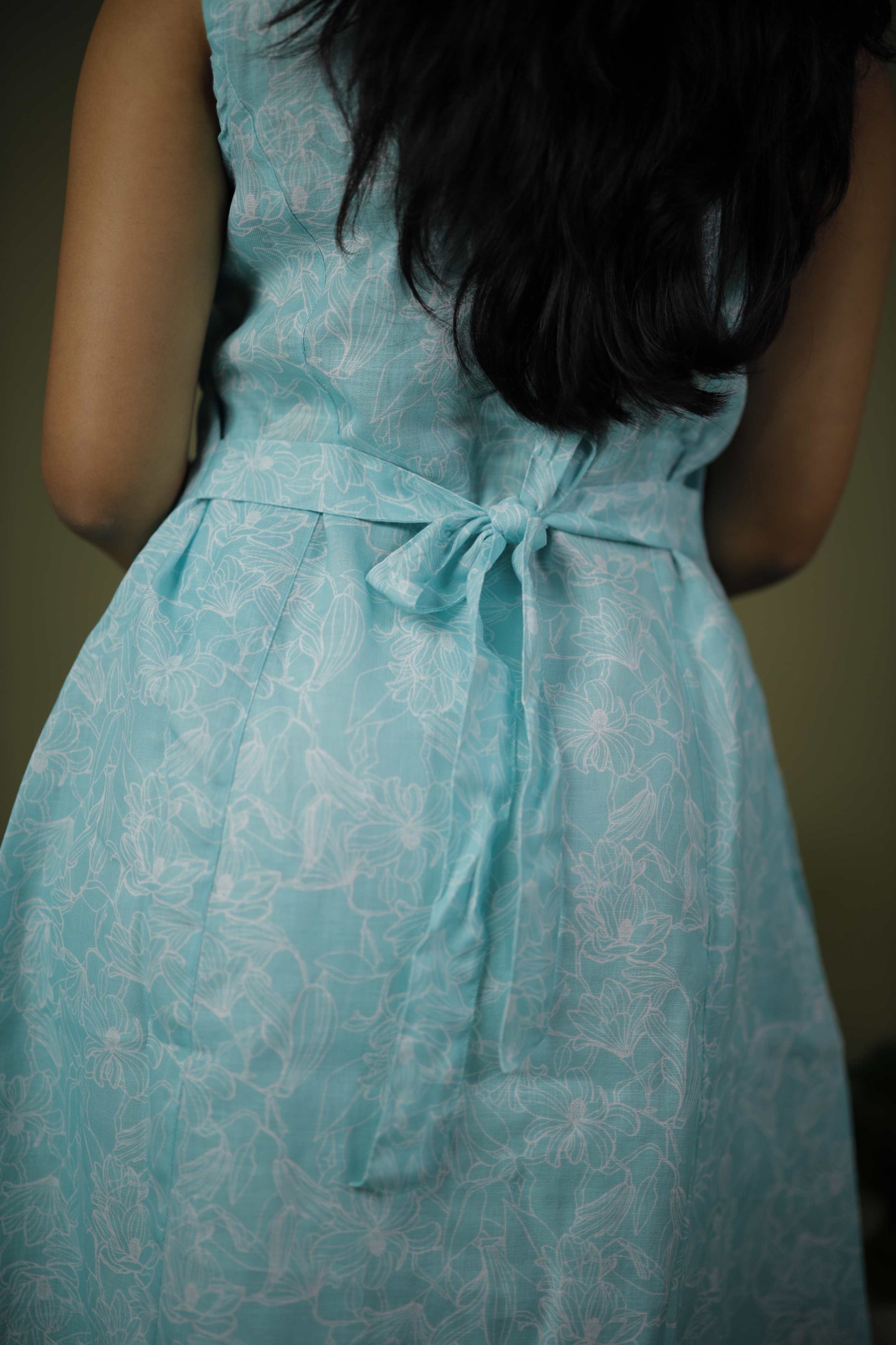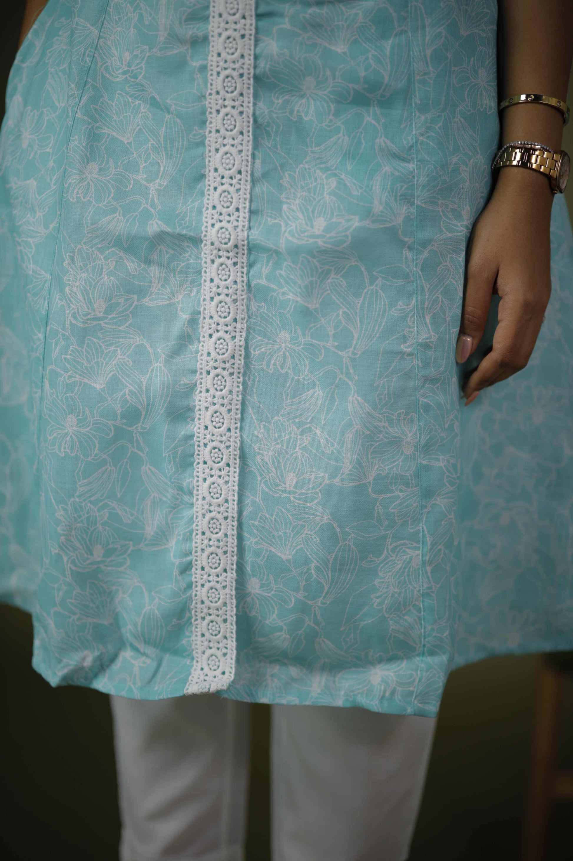 Kurta: Sleeveless, pastel turquoise with floral print