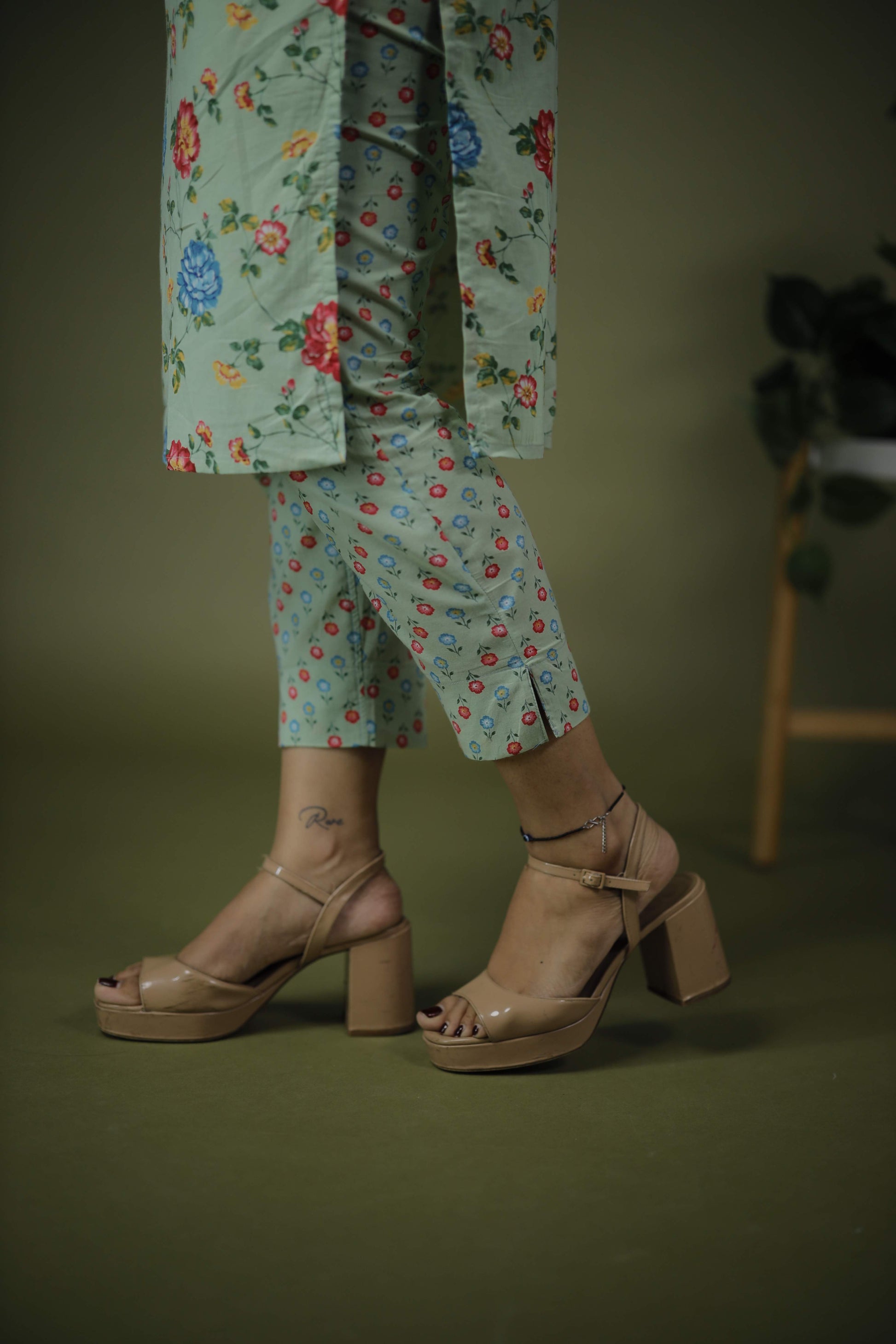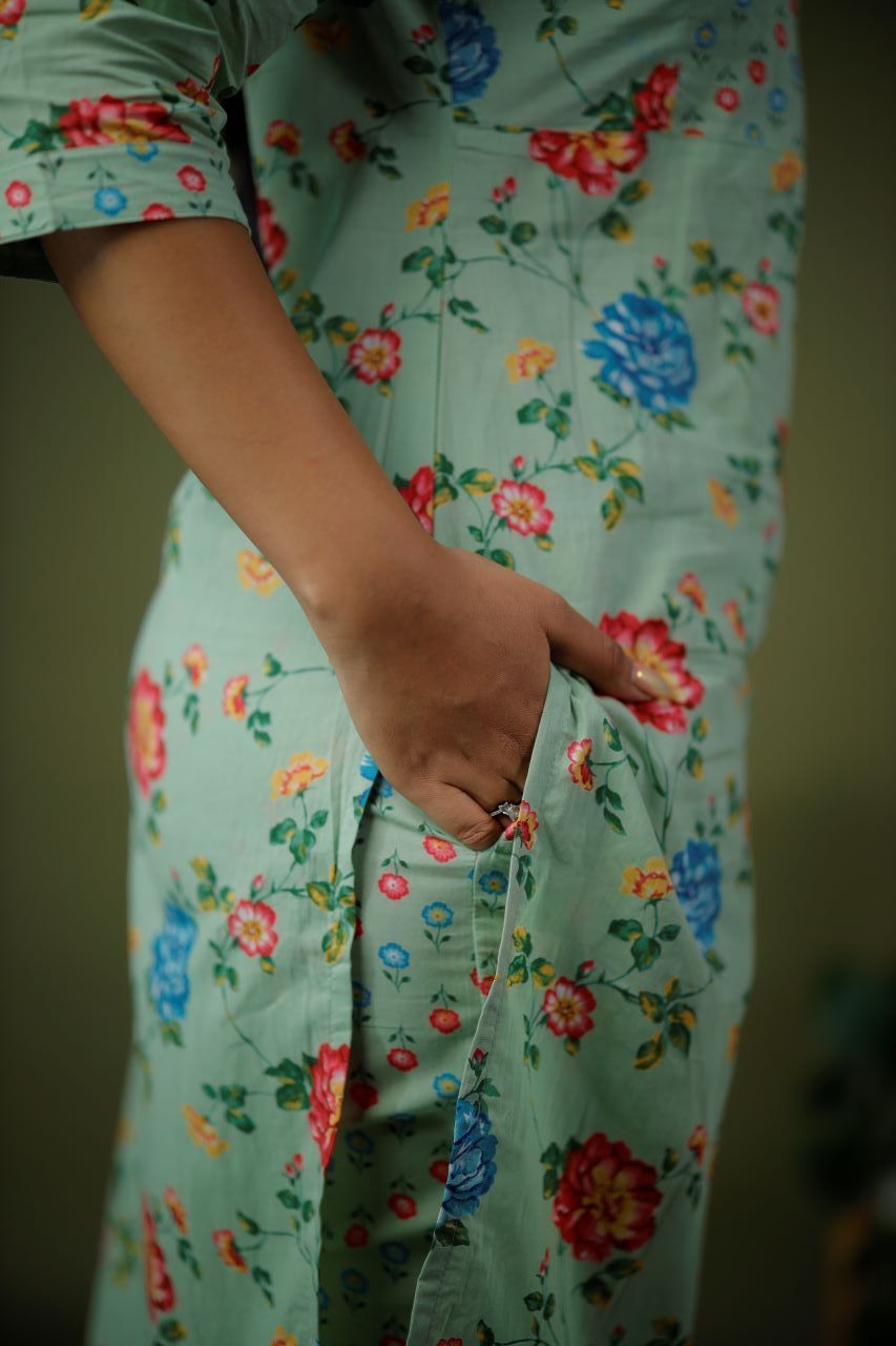 Color: pastel green base with a Floral print featuring vibrant red, blue and yellow flowers.