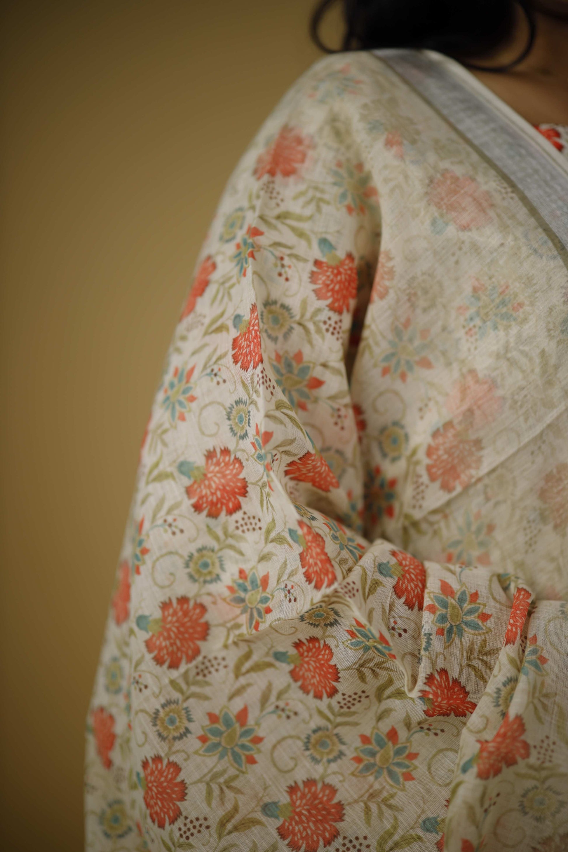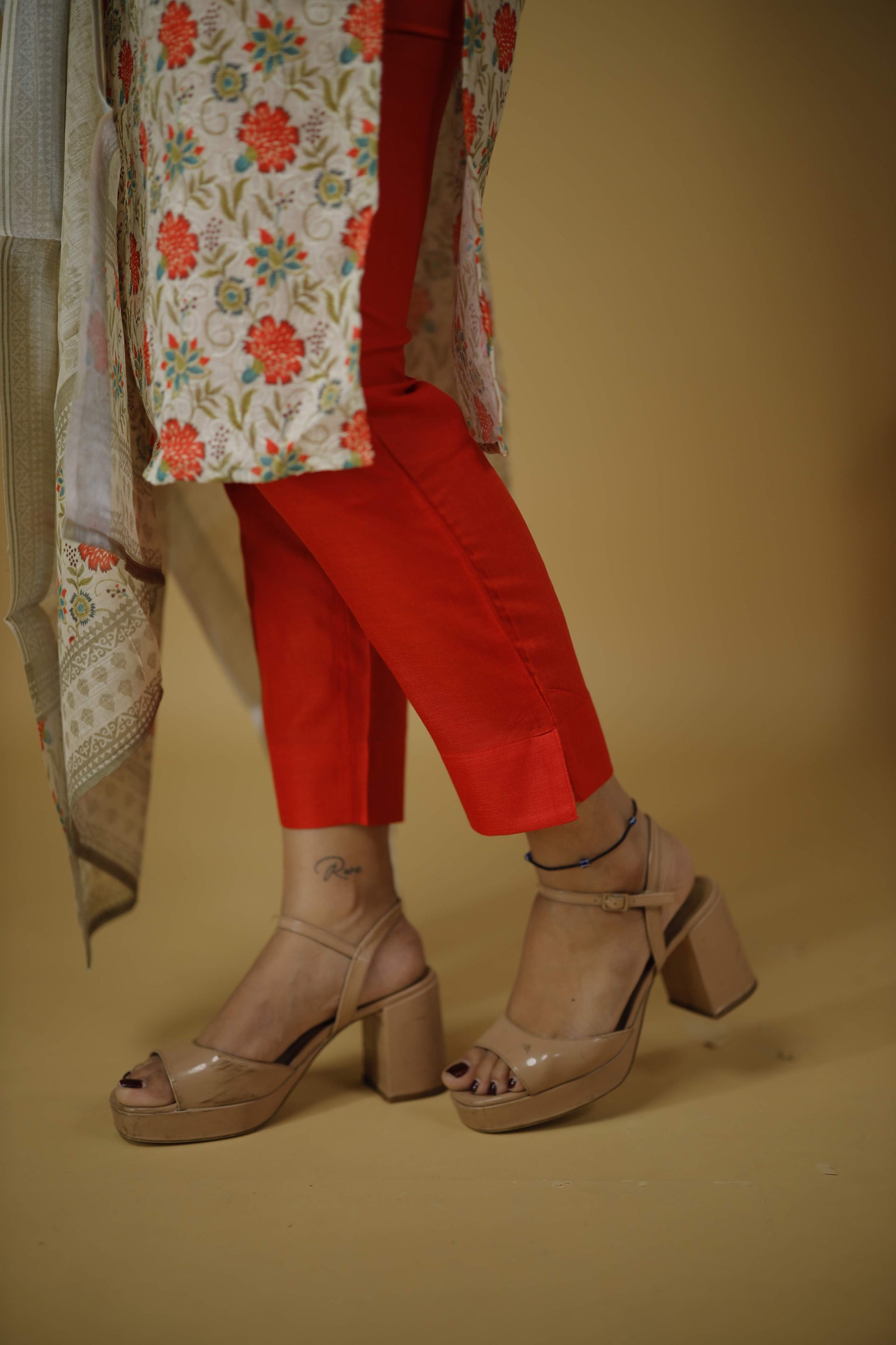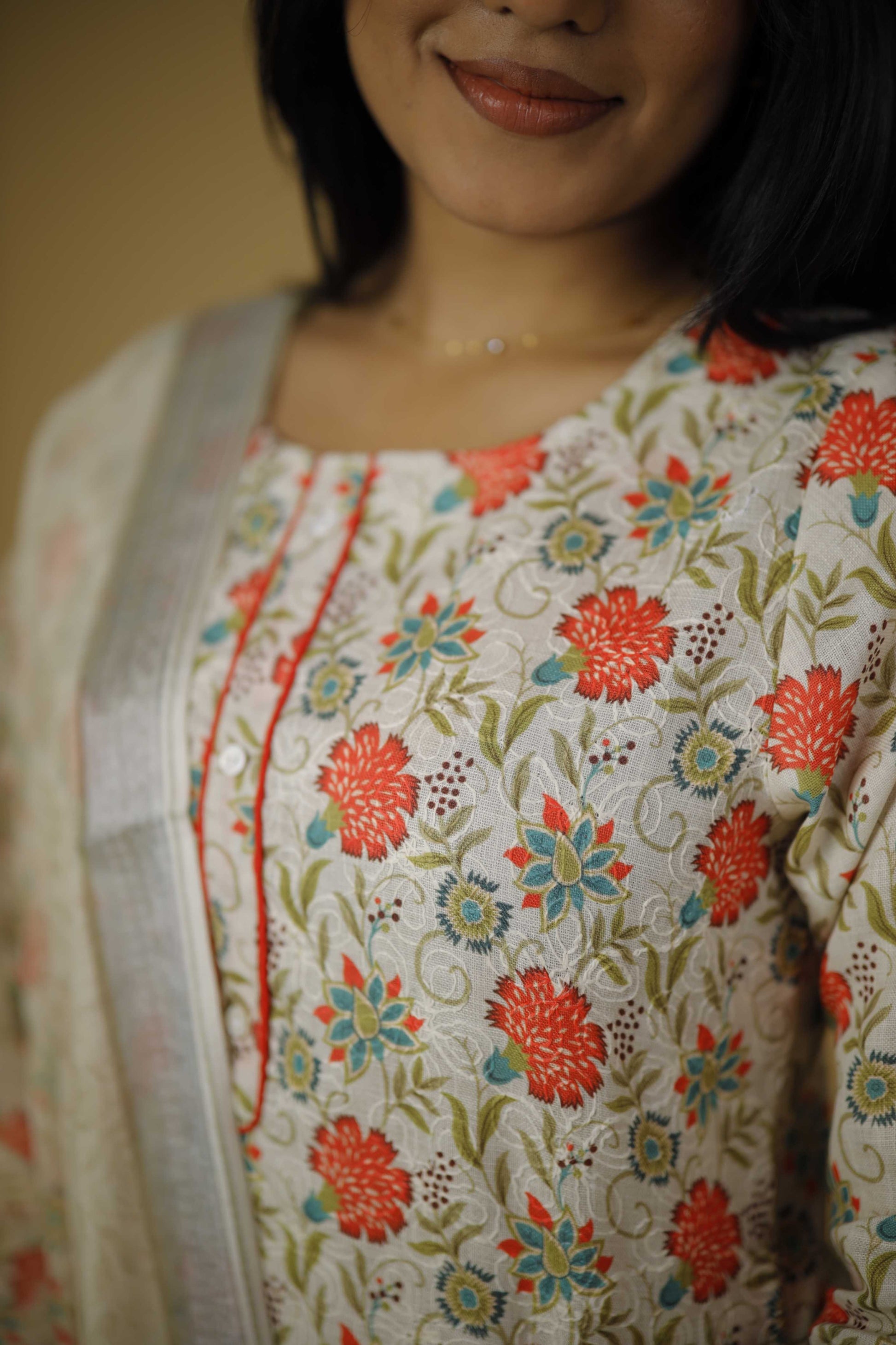 Kurta: Cream-colored with vibrant floral prints in red, orange and green. Three-quarter sleeves with printed cuffs.